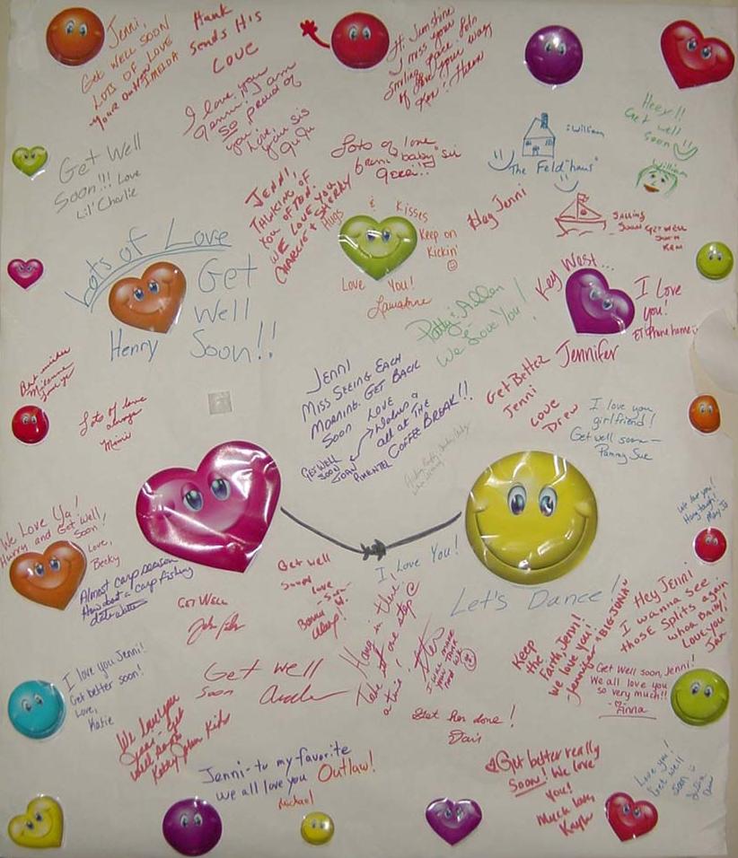 | 4/25/05 | I apologize to all of you "Jenni junkies" out there waiting daily for the updates. I am running out of ways to say, "She is doing well" or "she continues to improve" daily. I will update this website every few days instead of the daily routine. |